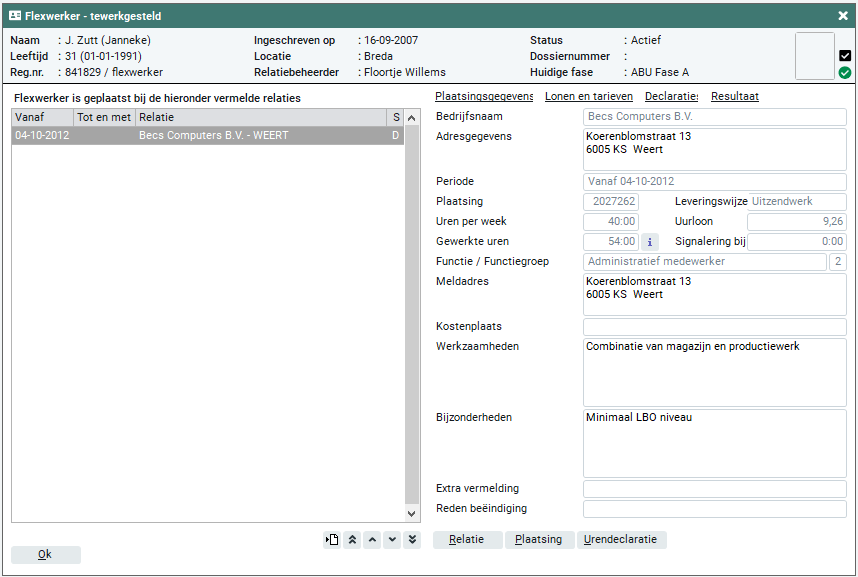 Op dit tabblad worden alle relaties getoond waarbij de flexwerker is geplaatst. Je kunt op dit tabblad geen gegevens invoeren of wijzigen, je kunt alleen maar gegevens raadplegen. De volgende plaatsingen worden getoond: