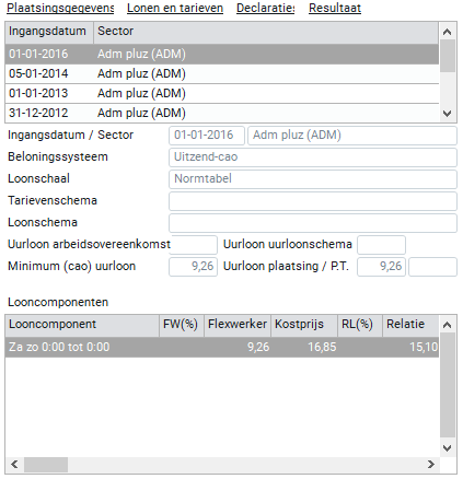 In dit onderdeel kun je zien welke looncomponenten er in de geselecteerde plaatsing worden gebruikt. Je kunt de knop 'detail' gebruiken om de volledige informatie van het gekozen looncomponent te zien. Wanneer je de knop 'Urendeclaratie' activeert worden alle urendeclaraties getoond van de flexwerker.