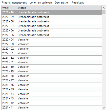 Dit onderdeel laat de verschillende urendeclaraties zien, het jaar en weeknummer wordt per regel getoond. Daarachter zie je de status van de urendeclaraties die bij de geselecteerde plaatsing (aan de linkerkant van dit tabblad) horen.