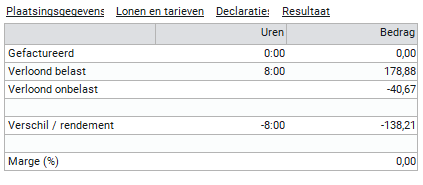 Dit onderdeel laat de resultaten zien van de plaatsing. De gefactureerde uren/bedrag en de verloonde uren/bedrag en de behaalde marge met deze plaatsing worden getoond. Wanneer je de knop 'Urendeclaratie' activeert worden alle urendeclaraties getoond van de flexwerker.