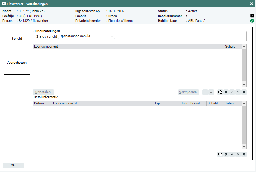 Het bovenste deel van het scherm toont de totale schuld per looncomponent. Voor de verrekening wordt als eerste gekeken naar de bovenste schuld.