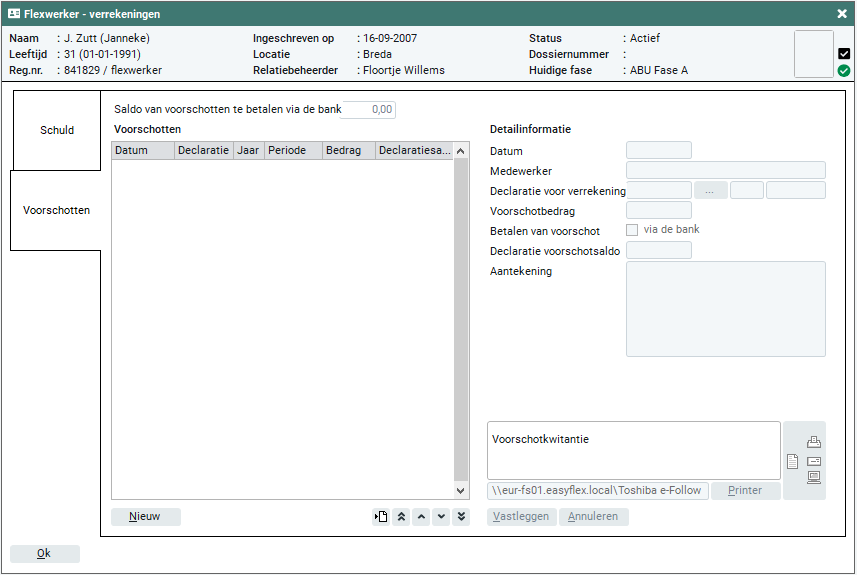 Wanneer je als 'Voorschotbedrag' een positief bedrag ingeeft, wordt dit ingehouden bij de flexwerker. Je kunt ook een negatief 'Voorschotbedrag' ingeven, deze wordt dan uitgekeerd. Wanneer je een voorschot meteen via de bank wilt betalen moet je een positief bedrag ingeven.