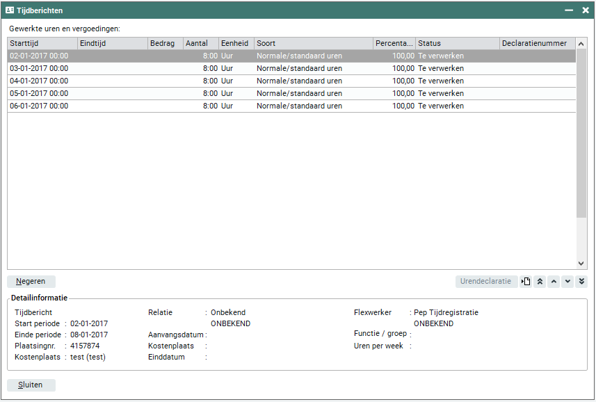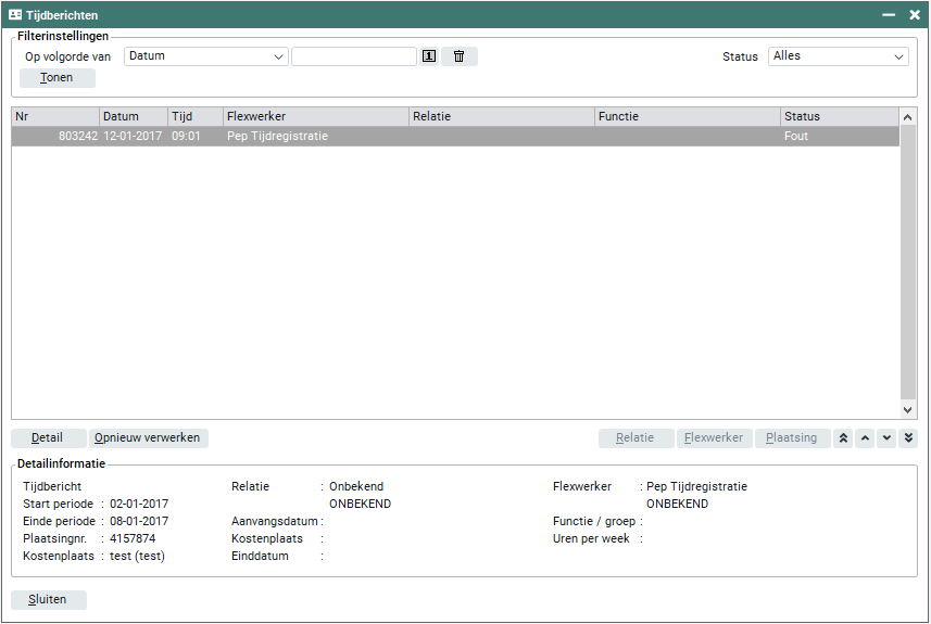 Een tijdbericht welke de status 'Fout' heeft kan niet worden verwerkt. Door met de cursor van de muis boven deze regel te 'hangen' wordt er een hint getoond waarin vermeld staat wat de aard van de fout is. Voorbeelden van fouten kunnen zijn: