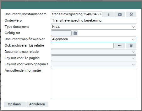Door het activeren van de knop 'Rapport' wordt een printbare versie van de berekening van de transitievergoeding getoond. Ook heb je de mogelijkheid het rapport de archiveren door bij rapport op het pijltje de klikken en te kiezen voor 'Rapport archiveren'.
