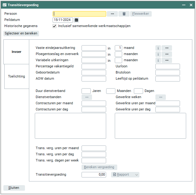 Wanneer je een persoon en een peildatum geselecteerd hebt, kan je klikken op selecteer en bereken. De transitievergoeding wordt vervolgens berekend. Op de tabbladen 'Invoer' en ‘Toelichting’ zie je vervolgens op basis van welke gegevens de transitievergoeding berekend is en welke berekening gebruikt is.