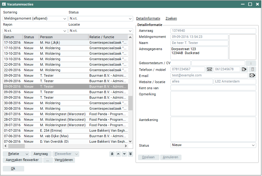 Op dit tabblad krijg je een overzicht van alle reacties op de aanvragen die op internet staan. Je kunt zo in één oogopslag zien wanneer er op welke aanvraag gereageerd is en door wie er is gereageerd. Wanneer je op een reactie klikt krijg je detailinformatie te zien van degene die heeft gereageerd. Je kunt direct de flexwerker aanmaken. Vanuit het overzicht kun je rechtstreeks naar de relatiekaart van de geselecteerde aanvraag. Ook kun je direct naar de geselecteerde aanvraag en eventueel naar de flexwerker, deze moet dan wel bekend zijn in je administratie. Wanneer je een e-mailadres hebt vastgelegd bij 'Beheer > Locaties' worden vacaturereacties ook naar het vastgelegde e-mailadres gestuurd. Dit scherm kan gemaximaliseerd worden. Daarnaast worden filterinstellingen onthouden.