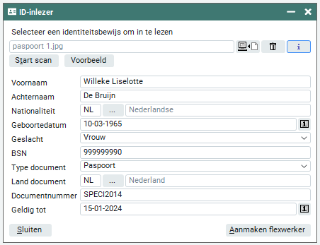 Wanneer het legitimatiebewijs is geselecteerd vanaf de computer klik je op 'Start scan'. De resultaten worden na het inlezen in de velden eronder getoond. De wijze waarop de resultaten worden getoond, is de wijze waarop ze worden overgenomen op het tabblad 'Algemeen' en 'Identiteitsgegevens' bij de flexwerker zodra het legitimatiebewijs wordt omgezet in een daadwerkelijke inschrijving. Met de knop 'I' kun je het ingelezen legitimatiebewijs inzien. Controleer de gegevens en wijzig daar waar nodig.