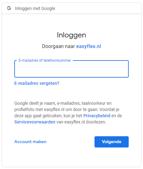 Zodra de beheerder een Google account gekoppeld heeft is het niet meer mogelijk om met je Easyflex Accountgegevens in te loggen. Je kunt alleen nog inloggen met het account van je organisatie.