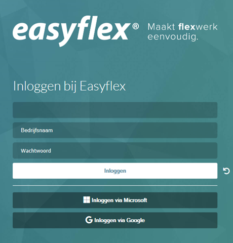 Om toegang te krijgen tot de Easyflex applicatie dien je op een correcte manier in te loggen. De eerste keer dat je inlogt, ontvang je van je beheerder inloggegevens. Deze inloggegevens bestaan uit een inlognaam of e-mailadres, bedrijfsnaam en wachtwoord.
