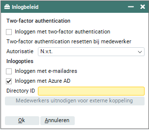 Op tabblad ‘Beheer > Inlogbeleid > Inlogopties’ kun je aanvinken of je gebruik wilt maken van het inloggen met Azure AD. Onder ‘Directory ID’ kan de tenant ID van Azure AD worden toegevoegd welke door jullie systeembeheerder is gecommuniceerd.
