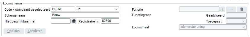 In dit veld dien je een schemanaam in te geven. Dit is de volledige naam van het uurloon schema. Deze naam mag uit cijfers, letters of een combinatie hiervan bestaan. De eerste letter van de naam wordt automatisch in een hoofdletter geplaatst.