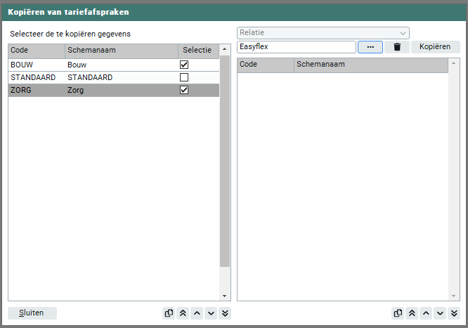 Middels de knop 'Kopiëren' kun je één of meerdere tarievenschema's kopiëren naar meerdere relaties en/of naar een andere werkmaatschappij (indien de samenwerking met deze werkmaatschappij aan staat). Als het tarievenschema reeds bestaat bij de andere werkmaatschappij, wordt het schema daar 'Bijgewerkt'. Als het tarievenschema reeds bestaat bij de relatie, dien je een afwijkende schemacode op te geven en wordt dit dus vastgelegd als nieuw tarievenschema.
