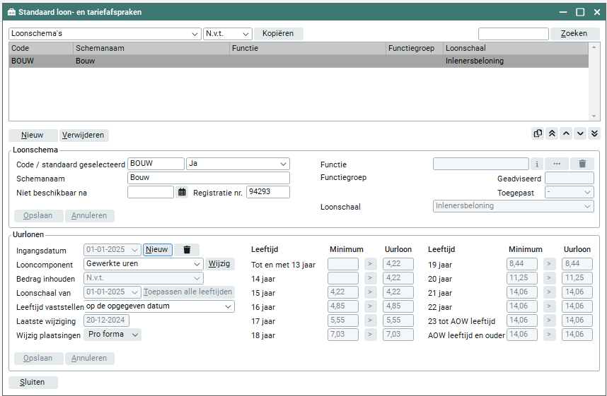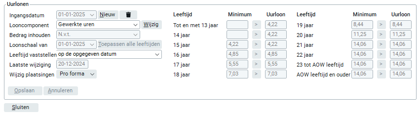 Easyflex toont je de minimum uurlonen per leeftijd. Je kunt handmatig de uurlonen ingeven, echter mogen deze nooit lager zijn dan de minimum uurlonen per leeftijd. Wanneer het uurloon lager is dan het minimum, wordt dit uurloon rood getoond.
