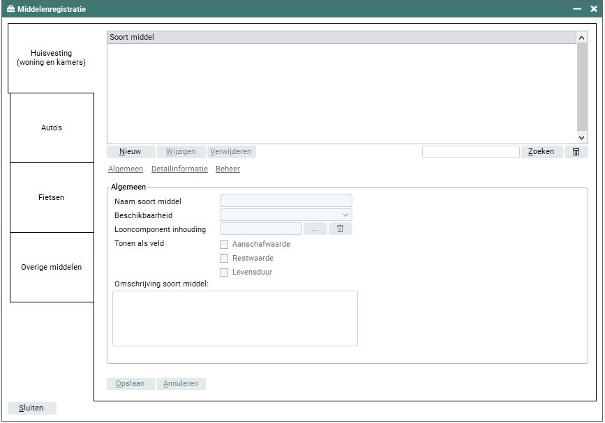Dit zijn de sub-tabbladen welke per soort middel gebruikt kan worden. Standaard opent het scherm in het sub-tabblad 'Algemeen'. Om naar 'Detailinformatie' of 'Beheer' te kunnen gaan dien je het soort middel eerst op te slaan.