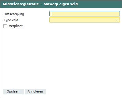 In dit scherm maak je een nieuw eigen veld aan dat bij elk middel welke je in 'Backoffice > Middelenregistratie' aanmaakt zichtbaar wordt. Met deze velden kun je de gewenste informatie per middel vastleggen.