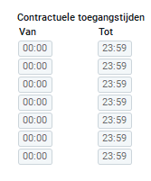 Binnen de werkmaatschappij kunnen standaard toegangstijden worden vastgelegd. Deze standaard toegangstijden worden vastgelegd binnen de bedrijfsinstellingen (Beheer > Bedrijfsinstellingen > Toegangstijden) en vallen uiteraard altijd binnen de contractuele toegangstijden.
