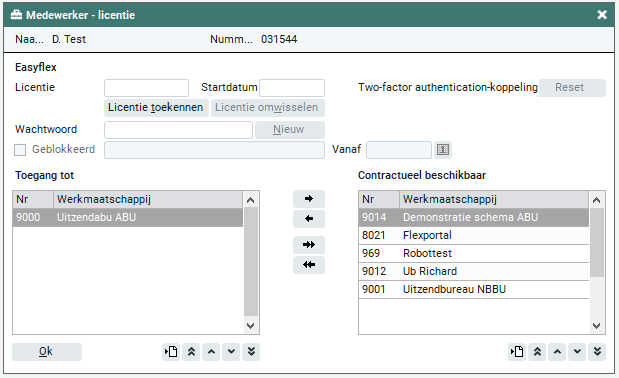 In het veld 'Toegang tot' verschijnt automatisch de werkmaatschappij waarin de medewerker (en de locatie van de medewerker) is ingevoerd. Wanneer de werkmaatschappij een contractuele overeenkomst heeft waarin is bepaald dat er ook gebruik gemaakt kan worden van gegevens van andere werkmaatschappijen, worden deze betreffende werkmaatschappijen getoond in het venster 'Contractueel beschikbaar'. Met de horizontale pijltjestoetsen, kun je deze werkmaatschappijen overzetten naar het venster 'Toegang tot' zodat de betreffende medewerker ook kan inloggen in deze werkmaatschappijen. Is dit venster leeg, dan heeft de werkmaatschappij geen overeenkomst met andere werkmaatschappijen.