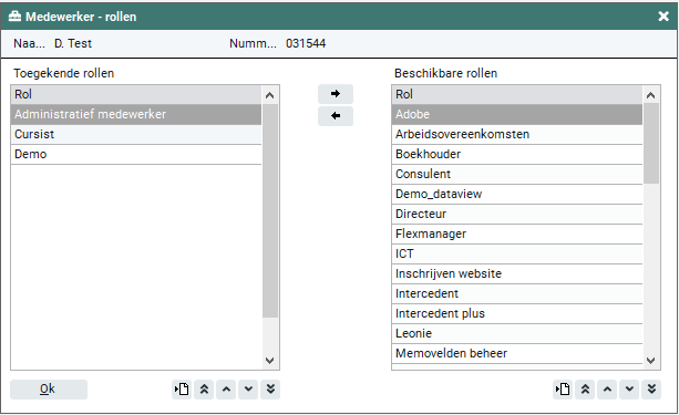 Met de horizontale pijltjestoetsen kun je beschikbare rollen overzetten naar toegekende rollen en andersom.