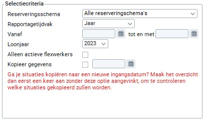 Als er in Beheer een nieuwe situatie vastligt, dan wordt er vanaf dat moment niet meer gekeken naar de afwijkende reserveringspercentages die bij de flexwerker vastliggen maar naar de situatie in Beheer, omdat Beheer op dat moment de 'hoogste’ ingangsdatum heeft. Indien je de afwijkende reserveringsschema's wil blijven toepassen, selecteer je 'Alle reserveringsschema's' of maak je een keuze uit de schema's en kopieer je de gegevens naar een nieuwe datum. Kopiëren naar het verleden is niet mogelijk.