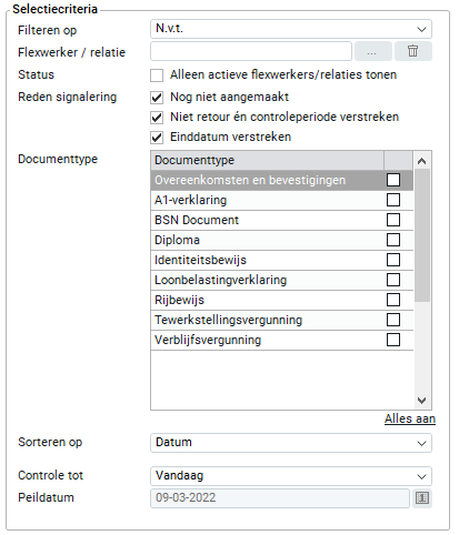 Op dit overzicht worden signaleringen omtrent documenten van flexwerkers en relaties getoond. De signaleringen hebben betrekking op documenten die ontbreken in het digitale archief of op documenten waarvan de einddatum verstreken is. Met behulp van de selectiecriteria kun je bepalen welke documenten op het overzicht worden getoond. Let op! Dit overzicht is alleen beschikbaar indien je gebruik maakt van document management.