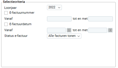 Als je de status wilt zien van bepaalde e-facturen binnen een periode, selecteer je deze optie. Je dient altijd een waarde (factuurnummer) op te geven in het veld 'Vanaf' of in 'Tot en met'.