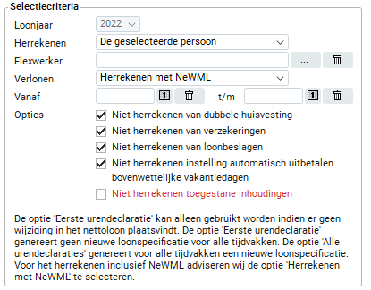 Op het moment dat het vinkje aanstaat wordt er voor de NeWML berekening gekeken naar de instelling zoals deze was ten tijde van de verloning. Staat het vinkje uit, dan wordt er voor de NeWML berekening gekeken naar de huidige instelling.Let op! Als je geen van bovenstaande opties selecteert worden al deze gegevens herrekend.