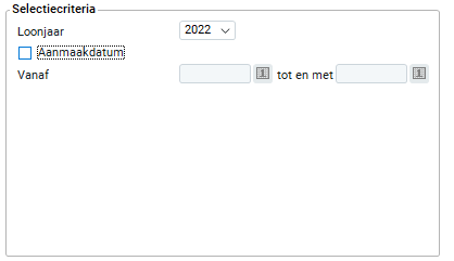 Je kunt een reeks loonspecificaties filteren op aanmaakdatum. Dit is de datum waarop de loonspecificatie daadwerkelijk is aangemaakt. Wanneer je deze optie selecteert dien je altijd een waarde (datum) op te geven in de velden 'Vanaf' en 'Tot en met'. Met behulp van de 'kalender-knop ' kun je een datum selecteren, of deze handmatig invoeren. Het gekozen jaar hoeft niet overeen te komen met het jaartal welke je bij 'Tot en met' heeft geselecteerd omdat een loonspecificatie in het ene jaar kan zijn geadministrateerd en in het andere zijn aangemaakt. Denk hierbij aan de jaarovergang.
