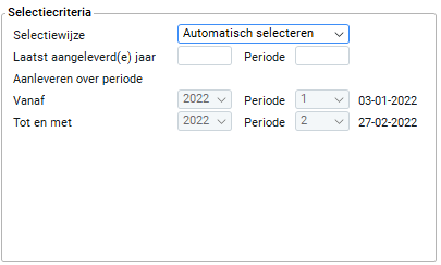 Wanneer je het aanleveren automatisch vaststelt, wordt de periode gevuld met de laatst aan te leveren periode. Als je de periode handmatig vast stelt, kun je een keuze maken tussen alle perioden behorende bij het geselecteerde jaar.