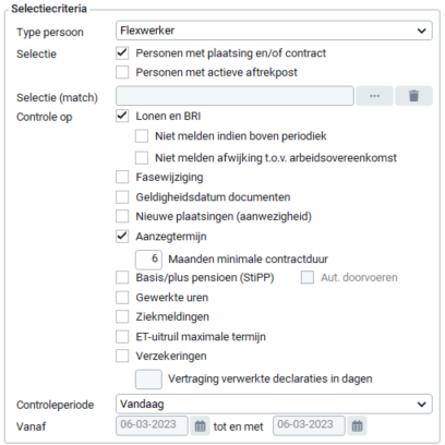 - 'Aut. doorvoeren': Automatisch doorvoeren van de StiPP-signaleringen. Alleen beschikbaar als enkel 'Basis/plus pensioen (StiPP)' is aangevinkt en de controleperiode 'Vandaag' is.