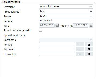 Op dit overzicht kun je een lijst krijgen van alle sollicitaties. Met behulp van de selectiecriteria kun je zelf bepalen hoe deze lijst eruit moet zien. Je kunt het overzicht op vele manieren uitsplitsen, waaronder sollicitaties per aanvraag, medewerker, flexwerker/relatie enz. Daarna kun je het overzicht nog verder uitlijsten. Hieronder staat uitgelegd wat de mogelijkheden zijn.