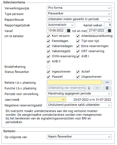 Voor alle flexwerkers die nog reserveringen hebben staan wordt een urendeclaratie aangemaakt voor het uitbetalen van reserveringen. Je kunt geen verdere selectie maken.Uitbetalen indien gewerkt in periode