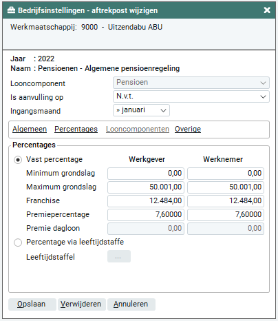 Als het pensioen wordt vastgesteld op basis van vaste percentages dien je in deze rubriek de gegevens vast te leggen. Deze gegevens dien je in te geven voor werkgever (werkmaatschappij) en werknemer (flexwerker).
