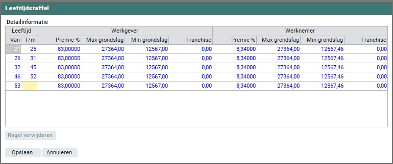 Als de pensioenpremie wordt vastgesteld op basis van vaste gegevens per leeftijdscategorie dien je dit middels de 'Leeftijdsstaffel' in te richten.