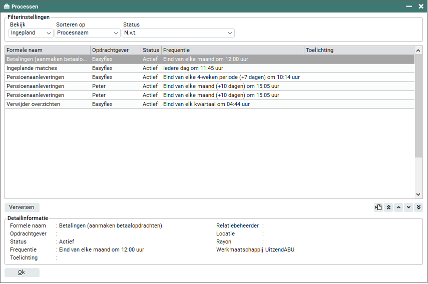 Binnen het onderdeel processen kun je bekijken welke processen (overzichten) openstaan, zijn ingepland of reeds zijn aangemaakt. Ook wordt getoond door welke medewerker de opdracht is gegeven. Het betreft alle overzichten welke zijn aangemaakt in de modules 'Backoffice', 'Frontoffice' en 'Mijn gegevens'.