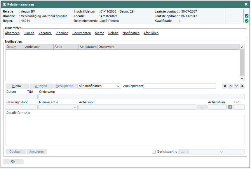 Wanneer je een nieuwe notificatie aanmaakt, ben je verplicht een onderwerp in te geven. Wanneer dit veld niet wordt ingevuld, wordt dit aan jou gemeld en krijg je de gelegenheid dit te corrigeren. Tevens kun je bij deze notificatie gelijk een nieuwe actie plannen. Deze wordt automatisch gegenereerd op je inlognaam en is eventueel te wijzigen door gebruik van de knop 'zoeken'. De actiedatum en tijd worden automatisch ingegeven op de huidige systeemdatum en -tijd, ook deze gegevens kunt, indien gewenst, aanpassen. Een voorbeeld van een nieuwe actie is bezoek, offerte of herinnering. Deze benamingen zijn door Easyflex vastgelegd. Een nieuwe notificatie wordt ook vastgelegd binnen de algemene notificaties van de relatie (Frontoffice > Relatie > Notificaties).