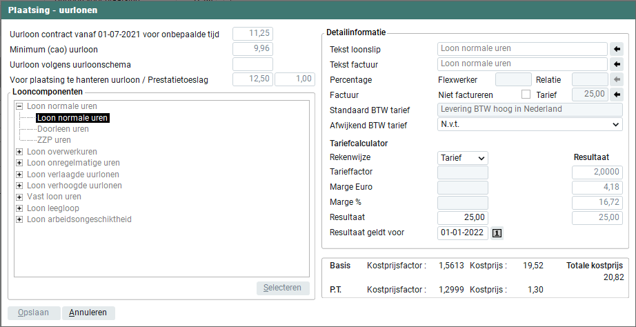 Easyflex rekent aan de hand van de door jou ingegeven bedragen en percentages, de kostprijs uit. Wanneer je 'Loon voor normale uren' hebt geselecteerd, worden alleen de 'Basis' gegevens getoond. Heeft u overige looncomponenten geselecteerd, worden ook de 'Toeslag' gegevens getoond.