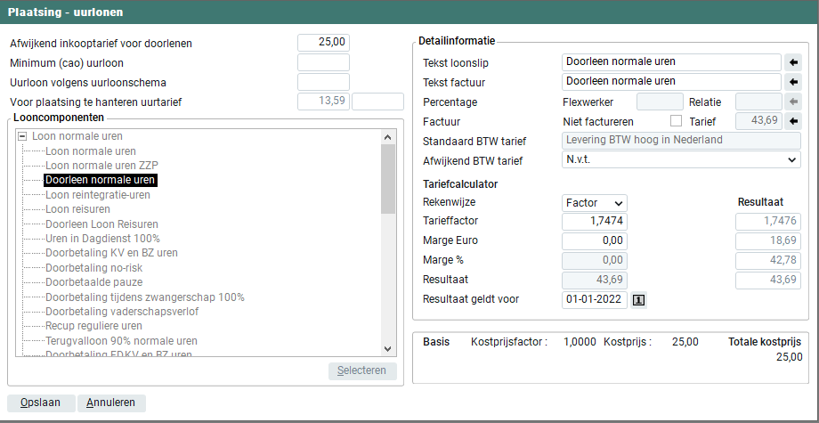 In geval van een doorleen- of ZZP-plaatsing is het ook mogelijk een afwijkend inkooptarief in te geven bij urencomponenten. Het is nodig om dit per looncomponent vast te leggen, indien van toepassing.