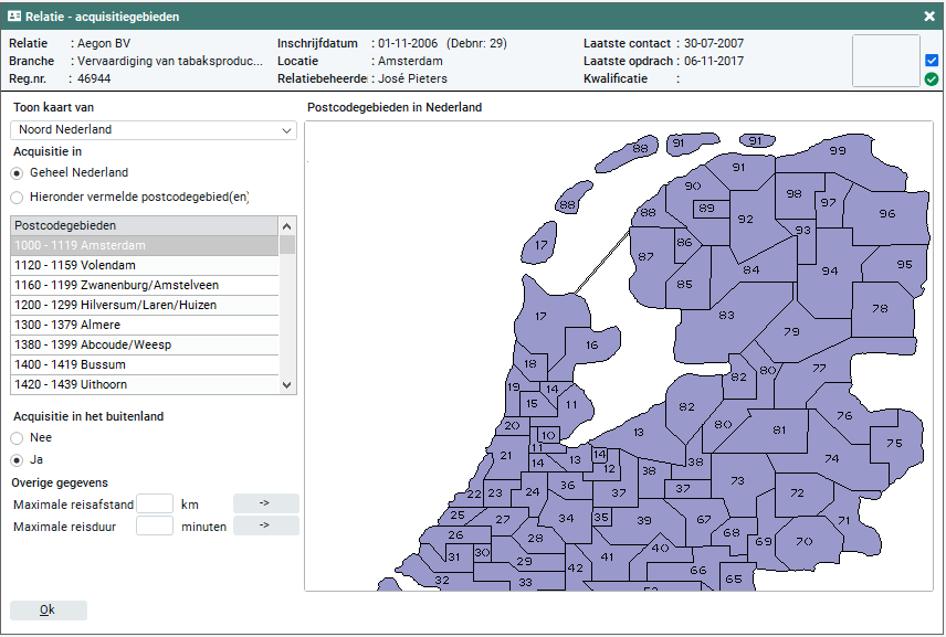 Binnen de overige gegevens kun je de maximale reisafstand en maximale reisduur berekenen. De basis voor deze berekening is de postcode van het bezoekadres van de relatie, vanuit deze postcode worden de maximale afstanden en tijden berekend.