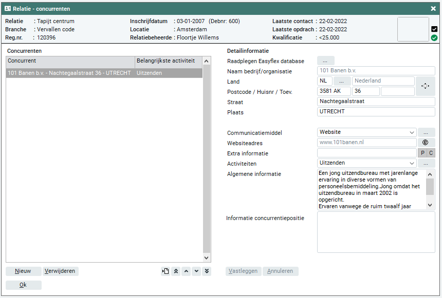 Easyflex houdt een database bij met concurrenten. Deze database bevat alle bedrijven in Nederland welke mogelijk concurrent kunnen zijn, bijvoorbeeld uitzendbureaus, detacheringsbureaus, werving & selectie bureaus. Wanneer je een concurrent uit de Easyflex database vastlegt wordt deze regel 'rood' getoond. Indien de concurrent van de relatie niet bekend is in de database, kun je handmatig een concurrent invoeren. Deze toevoeging is eenmalig, wil je de gegevens in de database van Easyflex opgenomen hebben meld dit dan bij support@easyflex.nl. Wanneer je handmatig een concurrent vastlegt wordt deze regel 'zwart' getoond.