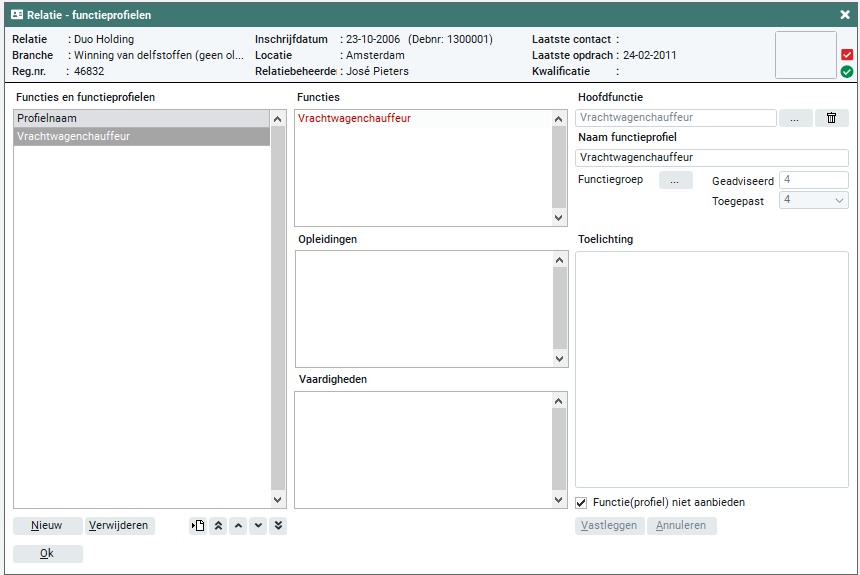 Op dit tabblad kun je de functieprofielen van de relatie aanmaken. Per functie kunnen de opleidingen, vaardigheden en andere specifieke functiewensen van de relatie worden vastgelegd. Deze functieprofielen kunnen heel handig worden toegepast bij een aanvraag van de relatie.