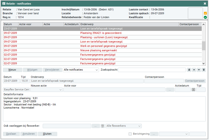 Op dit tabblad worden automatisch notificaties aangemaakt door Easyflex naar aanleiding van gemaakte wijzigingen in de gegevens van de relatie en kun je zelf nieuwe notificaties aanmaken. Ook notificaties welke zijn aangemaakt binnen het tabblad 'Contactpersonen' en 'Aanvragen en plaatsingen' worden in dit algemene notificatie tabblad vastgelegd.