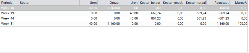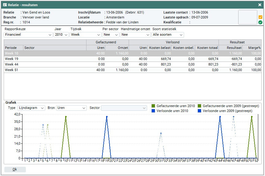 Op dit tabblad worden alle resultaten van de relatie getoond. Het betreft gefactureerde gegevens, verloonde gegevens en het uiteindelijke resultaat.