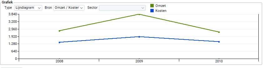 Wanneer je boven in het scherm hebt gekozen voor 'Per sector' voor 'Ja' dan heb je bij het Grafiekgedeelte de mogelijkheid om per sector de behaalde omzet te zien. Wanneer bij de betreffende relatie in één sector is gewerkt kun je bij het Grafiekgedeelte niet voor een andere sector kiezen. Wanneer je boven in het scherm hebt gekozen voor het tijdvak 'jaar' dan zie je bij het Grafiekgedeelte dat alle jaren met resultaten getoond worden.