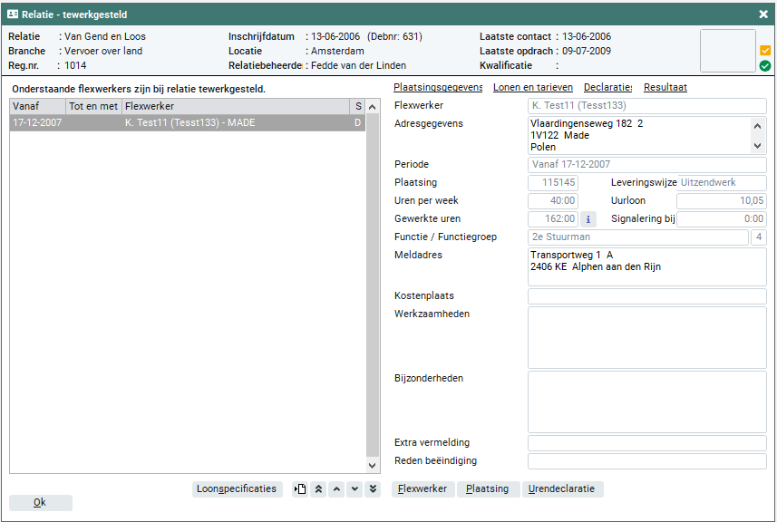 Op dit tabblad worden alle flexwerkers getoond welke geplaatst zijn bij de relatie. Je kunt op dit tabblad geen gegevens invoeren of wijzigen, je kunt alleen maar gegevens raadplegen. Ook kun je alle nog niet verwerkte loonspecificaties behorende bij de actieve plaatsingen afdrukken. De volgende plaatsingen worden getoond: