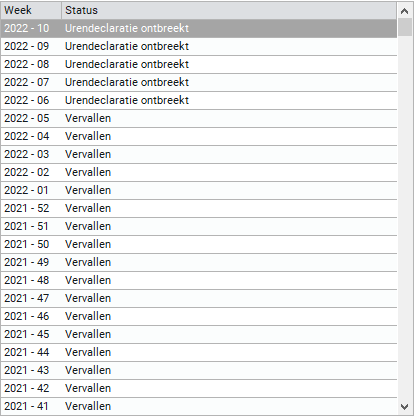 Dit onderdeel laat de verschillende urendeclaraties zien, het jaar en weeknummer wordt per regel getoond. Daarachter zie je de status van de urendeclaraties die bij de geselecteerde plaatsing (aan de linkerkant van dit tabblad) horen.