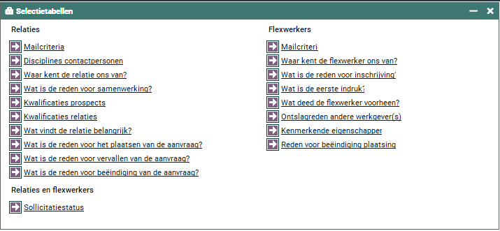 Onderstaande selectietabellen hebben betrekking op de relaties flexwerkers van je werkmaatschappij.