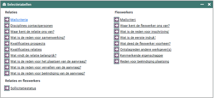 Voor de juiste invoer van relaties en flexwerkers kun je selectietabellen bepalen. Hierin kan onder meer worden vastgelegd wat de reden van een relatie is voor het plaatsen van een aanvraag en wat de eerste indruk van een flexwerker is bij de inschrijving.