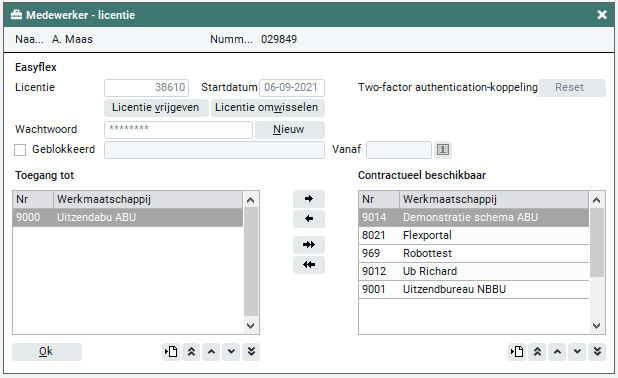 In 'Beheer > Medewerkers > Licenties' dien je aan te geven tot welke werkmaatschappijen je toegang wilt krijgen (haal van rechts naar links met de pijltjes).