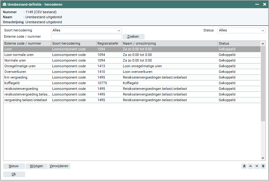 Voor de melding 'Hercodering', activeer je de knop 'Koppelen'. Je kunt nu het looncomponent hercoderen. De hercodering wordt automatisch in de urenbestand definitie opgeslagen in tabblad 'Urenbestand definities > Hercoderen'.