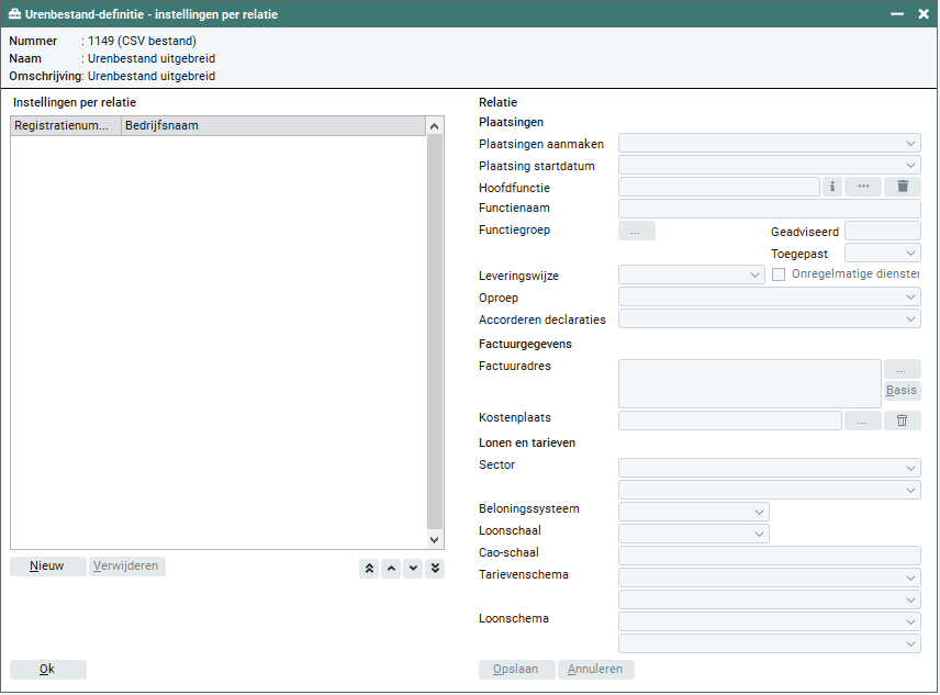 Tijdens het automatisch aanmaken van deze plaatsingen worden geen looncomponenten in de plaatsingen gezet (tenzij je werkt met tarievenschema's en de tariefschemacode in het urenbestand opneemt). Deze kun je zelf toevoegen in de plaatsing op het tabblad 'Lonen en tarieven'. Als er in een urenbestand meerdere relaties staan kun je dit ook per relatie in tabblad 'Urenbestand definities > Instellingen' vastleggen. In dit tabblad kun je ook een koppeling maken voor standaard factuuradressen, kostenplaatsen en lonen en/of tarievenschema's.